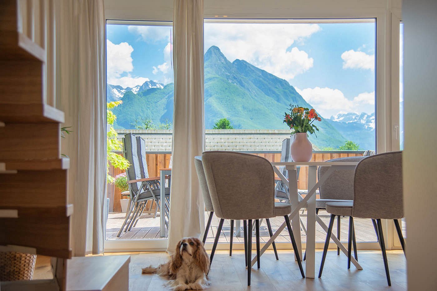 Helle, moderne Innenräume verbinden die Wärme natürlicher Materialien mit dem Komfort zeitgemäßer Ausstattung. Von der großzügigen Terrasse aus genießen Gäste einen atemberaubenden Blick auf die umliegenden Berge – perfekt für einen Morgenkaffee oder einen Drink zum Sonnenuntergang.