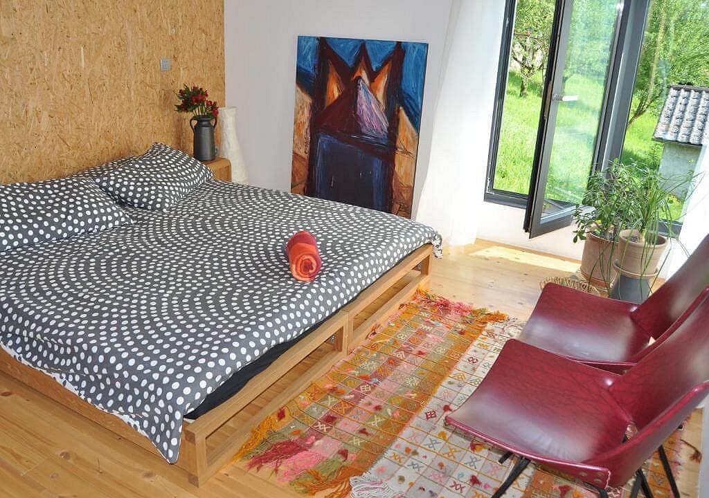 Hiša Gušta, which translates as House of Pleasure, is located in a sunny position in the village of Modrej (near Tolmin), in the immediate vicinity of Lake Soča. The house is architecturally designed as a dialogue between modernity and tradition. The main assets are the comfort of living and the view of the lake.