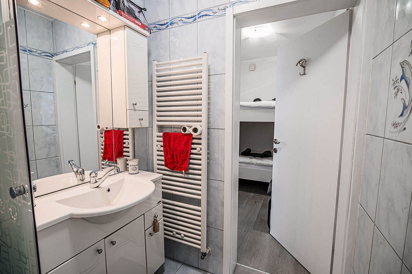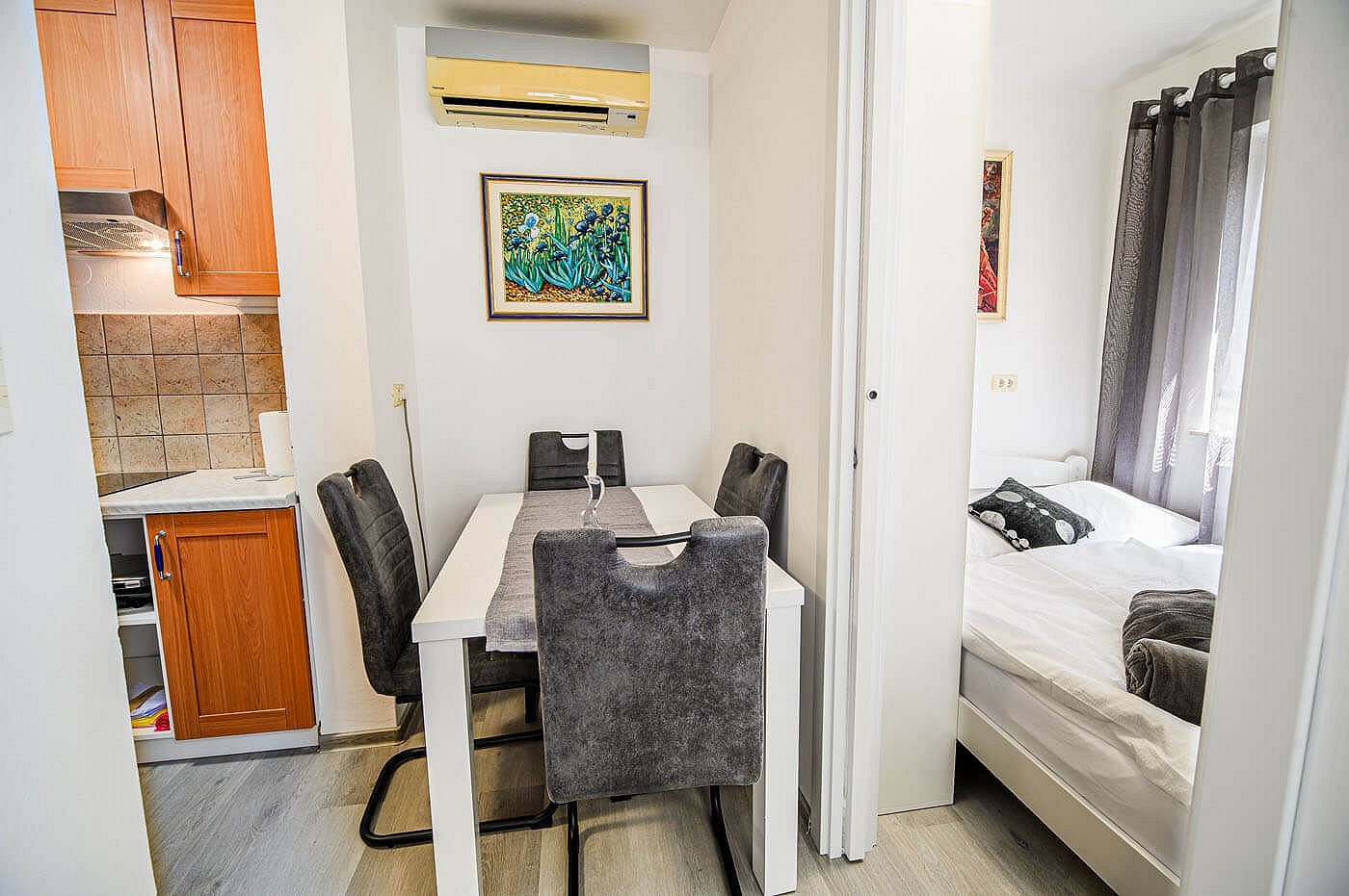 Apartment 1 is located on the ground floor of the house and is suitable for 4 people - 2 adults and 2 children. It measures 35 m2. The living room has a large sofa, two coffee tables and a TV. In front of the entrance to the kitchen niche is a table with 4 chairs, above it is an air conditioner. The kitchen is fully equipped and has all crockery and utensils, dishwasher, microwave oven, fridge, kettle and toaster. All basic spices are ready for cooking. Sliding doors lead to a bedroom with a double bed. In addition to the living room, there is also a bunk bed suitable for 2 children. The bathroom has a shower cabin, sink and toilet. You will be able to store your valuables in a safe. Free Wi-Fi is available. In front of the entrance is a small terrace with a nice garden furniture.
