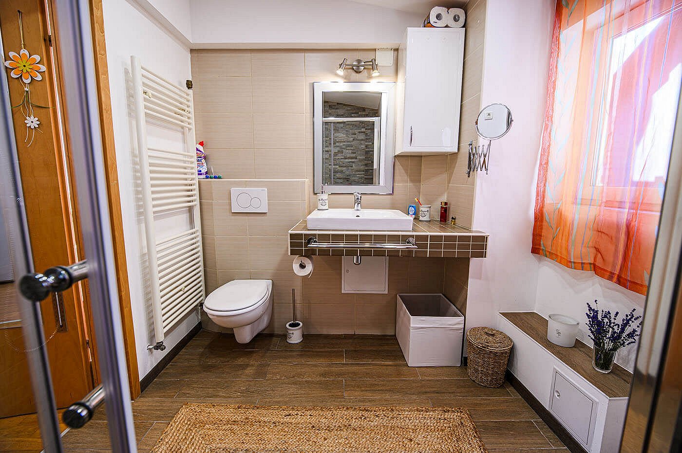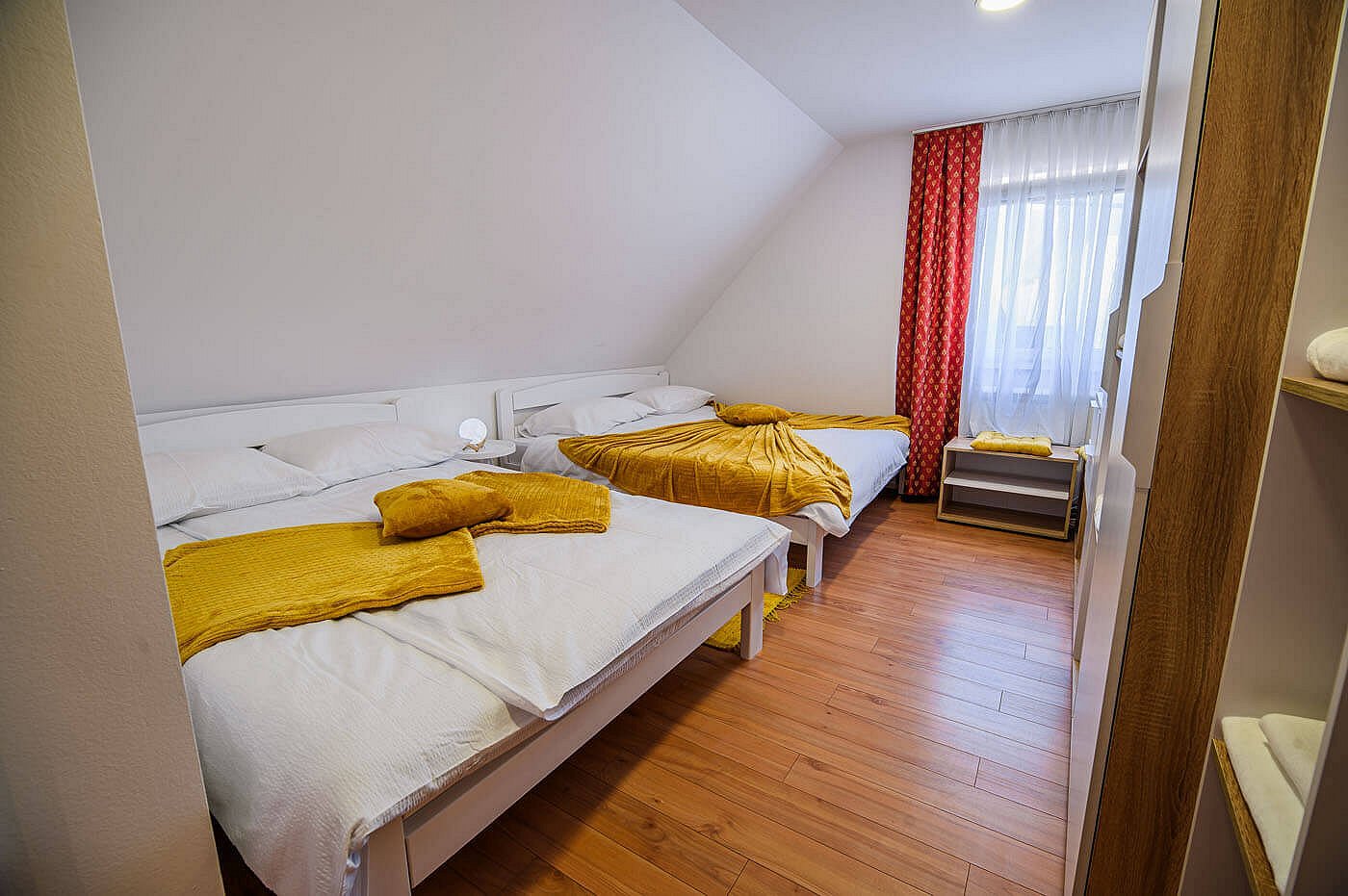 Apartment 2 is a duplex located on the 1st and 2nd floor of the house and additionally has an attic. It is suitable for 10 people. It measures 100 m2. In front of the entrance is a balcony with a table and chairs and an outdoor kitchen with a barbecue. The balcony fence is decorated with potted plants with fresh spices. On the 1st floor there is a living room with a large sofa set, a large coffee table, a TV and a fireplace that will warm you pleasantly on winter days. The dining room has a large family table for 10 people, and the famous Svinjak mountain can be seen from the window. The kitchen is fully equipped and has all crockery and utensils, dishwasher, oven, large fridge with freezer, kettle and toaster. All basic spices are ready for cooking. A sliding door leads to a bedroom with a double bed, above which there is another bed for a child. The stairs lead to the 2nd floor, where there are two bedrooms and a large bathroom. From both bedrooms you have a view of Svinjak mountain. The bathroom has a large shower, washing machine, sink and toilet. One bedroom has a double bed and a child's bed - suitable for 3 people, and the second bedroom has two double beds - suitable for 4 people. Both bedrooms have enough wardrobes, you will be able to store your valuables in the safe. In the attic there are additional beds for resting and watching the stars through the skylights. There is air conditioning in the hallway. Free Wi-Fi is available.