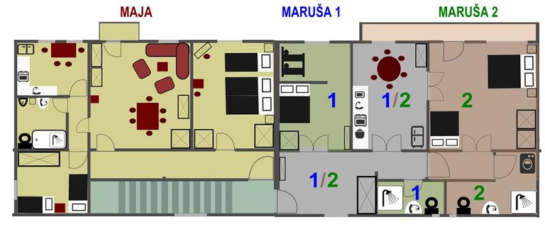 - ločen najem enote Maruša 1 ali enote Maruša 2. Del prostorov je v skupni uporabi.