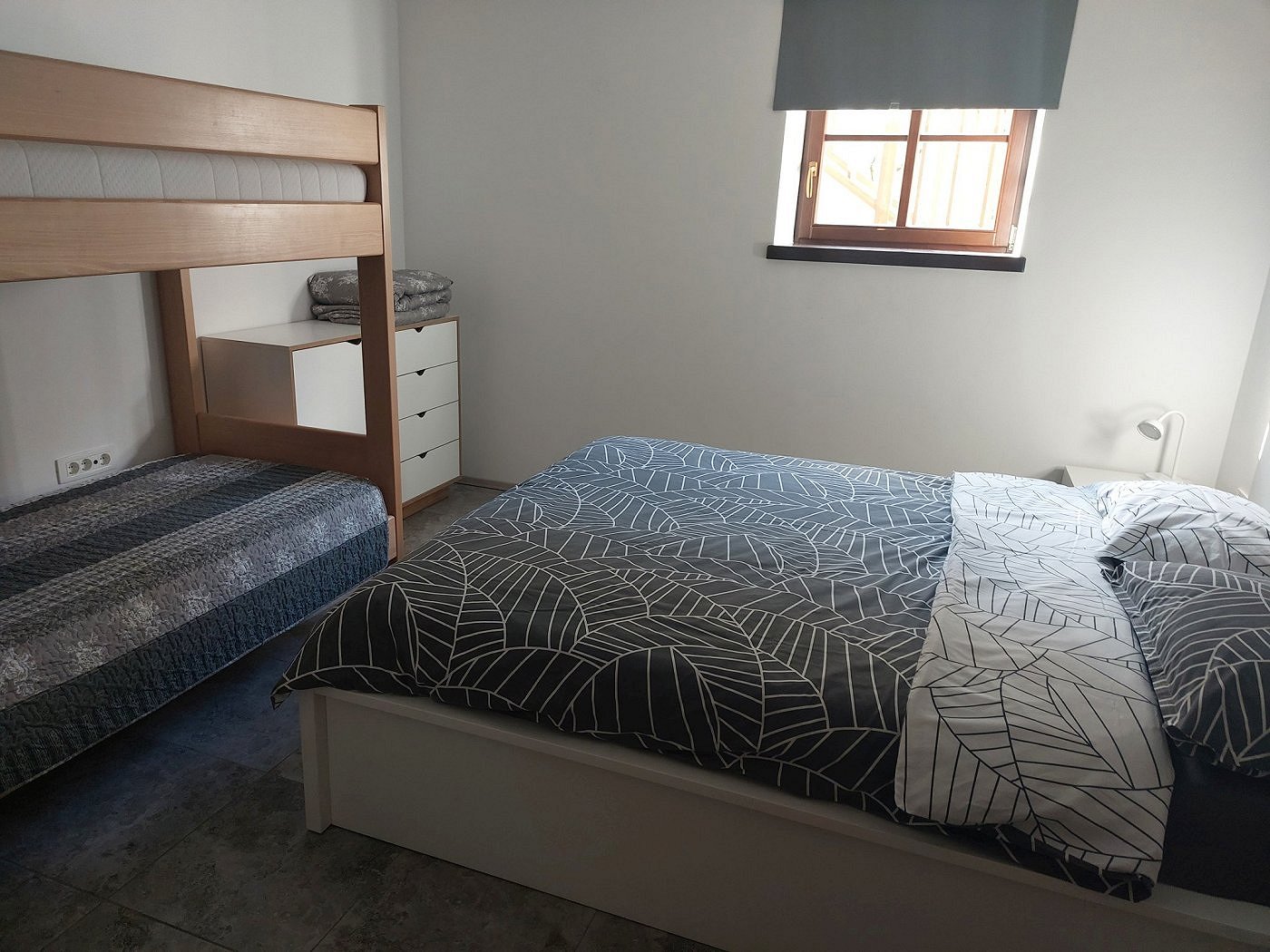 V spalnici je zakonska postelja in pograd, v dnevni sobi pa raztegljiv kavč. Apartma ima izhod na vrt.